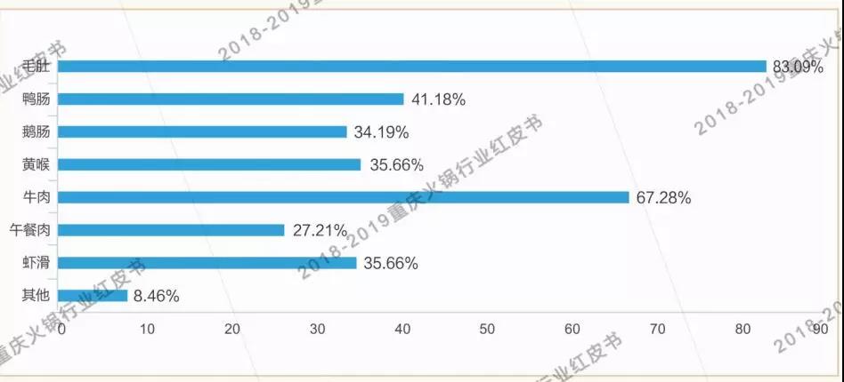 毛肚依然是重慶火鍋必點菜品之王,牛肉超越鴨腸,成為第二位重慶火鍋最受歡迎的葷菜。