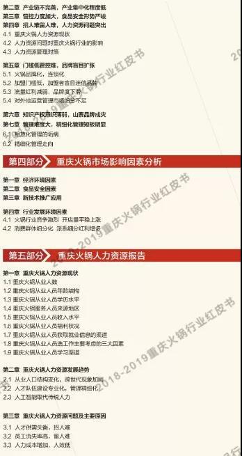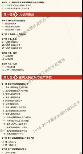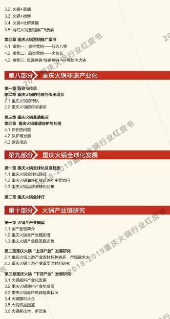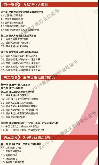 讓火鍋行業(yè)從業(yè)者更深入的了解重慶火鍋市場,讓重慶火鍋文化傳揚全世界,是我們所一直倡導(dǎo)的?!吨貞c火鍋紅皮書》根據(jù)大眾點評和美團網(wǎng)的數(shù)據(jù)收集,及對對重慶主城九區(qū)餐飲(火鍋)市場進行了摸底式調(diào)研,分析餐飲(火鍋)類商戶的相關(guān)數(shù)據(jù)得出結(jié)果,為學(xué)習(xí)交流之目的,我們特將目錄公布如下以供試閱。
